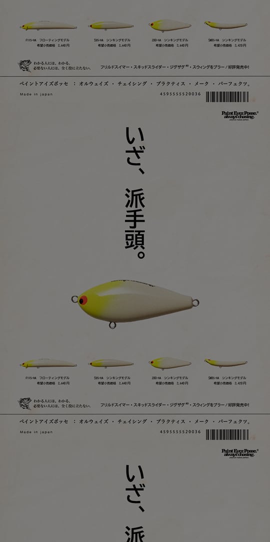 根本にあるのは、「釣り」 本来、”ペイントアイ”(書目)のルアーは、 より多くの魚を釣るための道具ではない。 魚と、自然と、時間と、 より深く、より楽しく遊ぶための存在である。 その思想の延長線上にあるのが、 PaintEyezPosse. PaintEyezPosse.は、 釣りに限らず、“ライフスタイル”そのものを深く愉しむためのアイテムやギアを展開している。 日常とフィールド。 街と自然。 どちらかを選ぶのではなく、 境界線を引かずに行き来できること。 わかる人には、わかる。 必要ない人には、全く役に立たない。 always chasing 「いつも追いかけている」 魚のこと。 そして、“あの頃”に描いた夢や希望。 時間が経っても、環境が変わっても、 追いかける対象は変わらない。 今も変わらず、その先を見ている。 practice makes perfect 「習うより慣れろ」 継続は力。 日々の繰り返しの中でしか、見えないものがある。 試して、使って、壊して、また使う。 その積み重ねの中でしか生まれない、 時代や流行に流されない、タフな“スタイル”。 PaintEyezPosse.は、 経験の中から滲み出た感覚を信じ、 自分たちのペースで、形にし続ける。