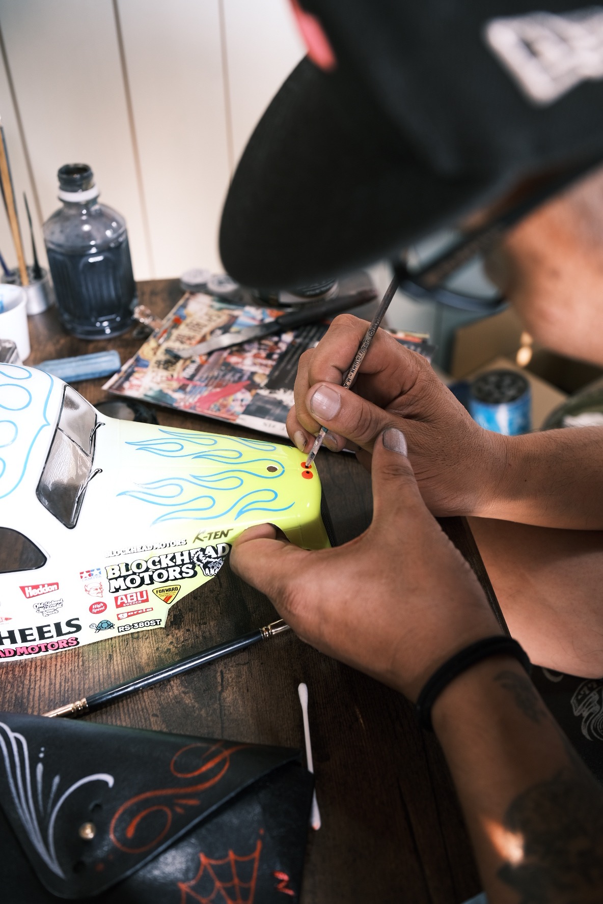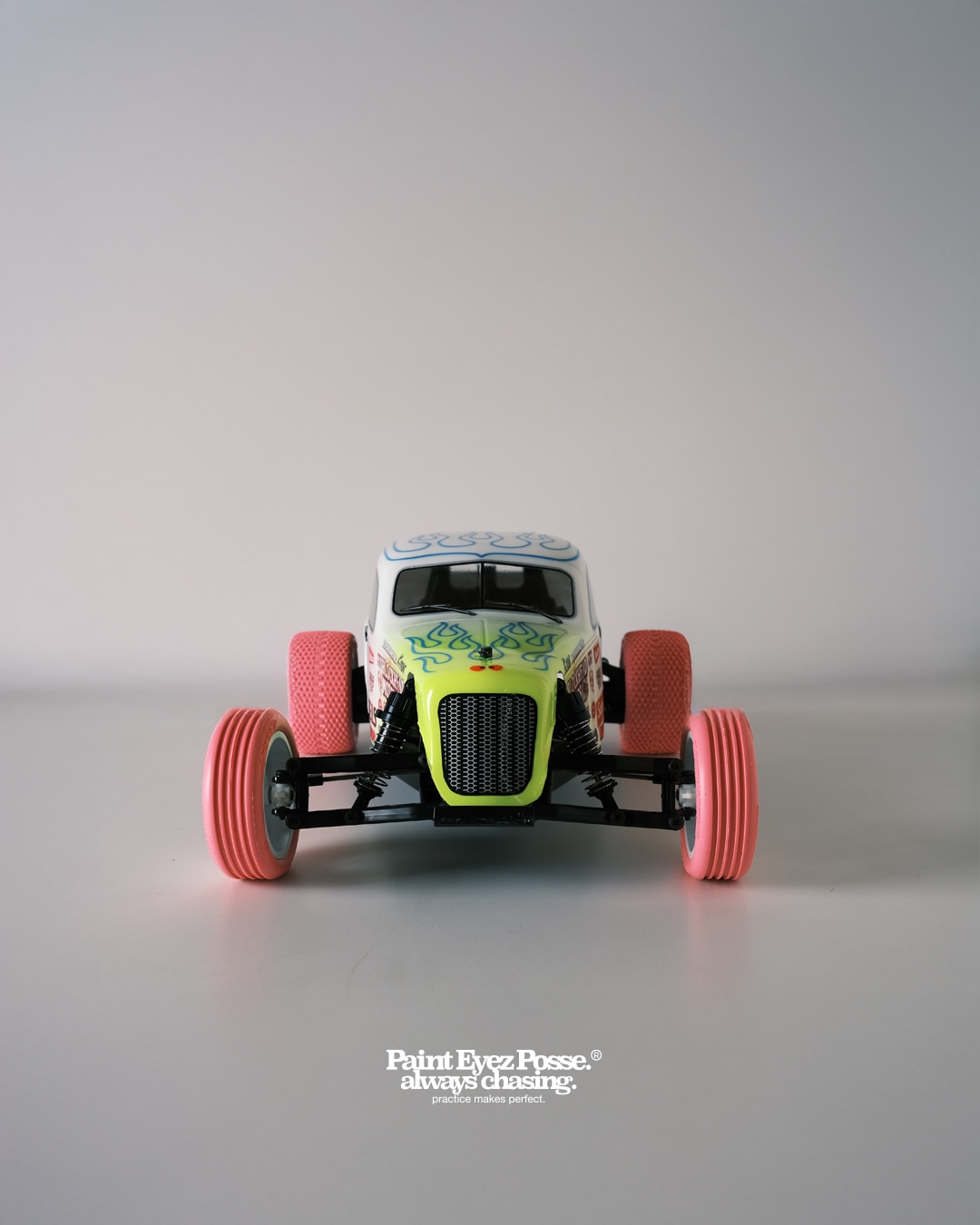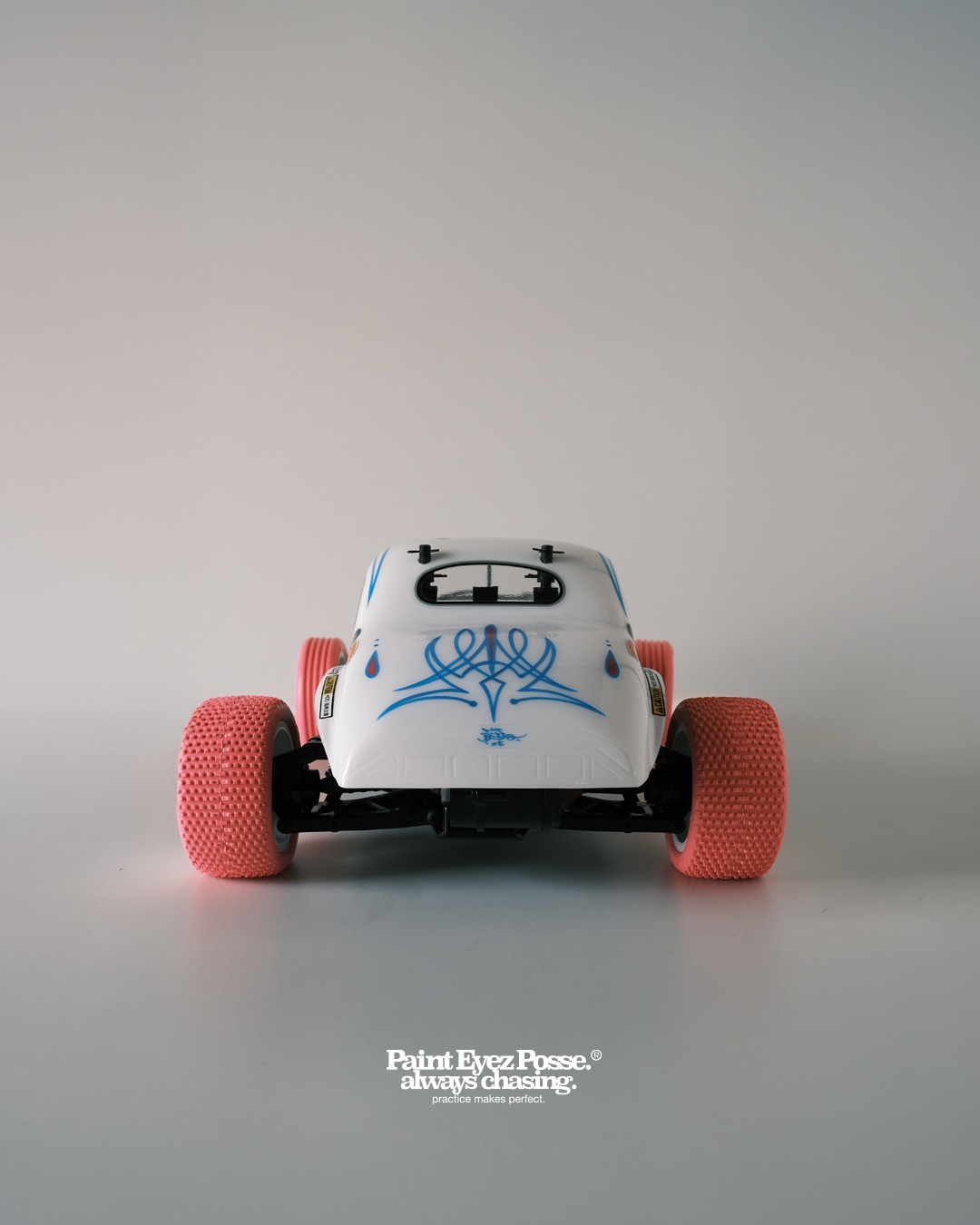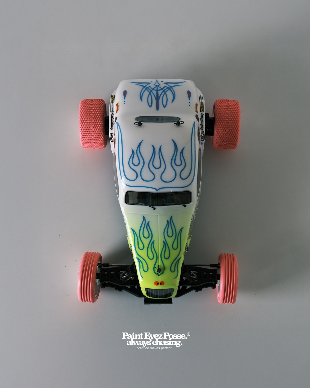 と言った具合なのですが、1番はやはり"釣り"と"ラジコン"そして、"カスタムカルチャー"をミックスさせるべく、この為だけに製作したデカール達(コレらはチェイスアフターのミチくんによるもの)、そしてそして、ピンストライパーである、BELL氏によるハンドペインティング。