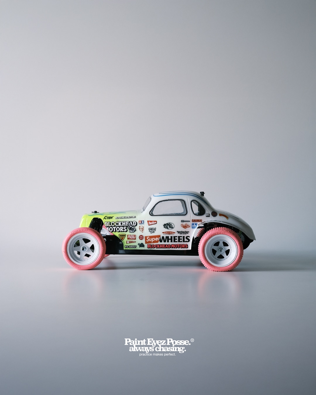 さらに、ホイールは京商のスコーピオン用のホワイトホイール、タイヤはブロックヘッドモータースさんとSweepさんのコラボのピンクタイヤを装着。